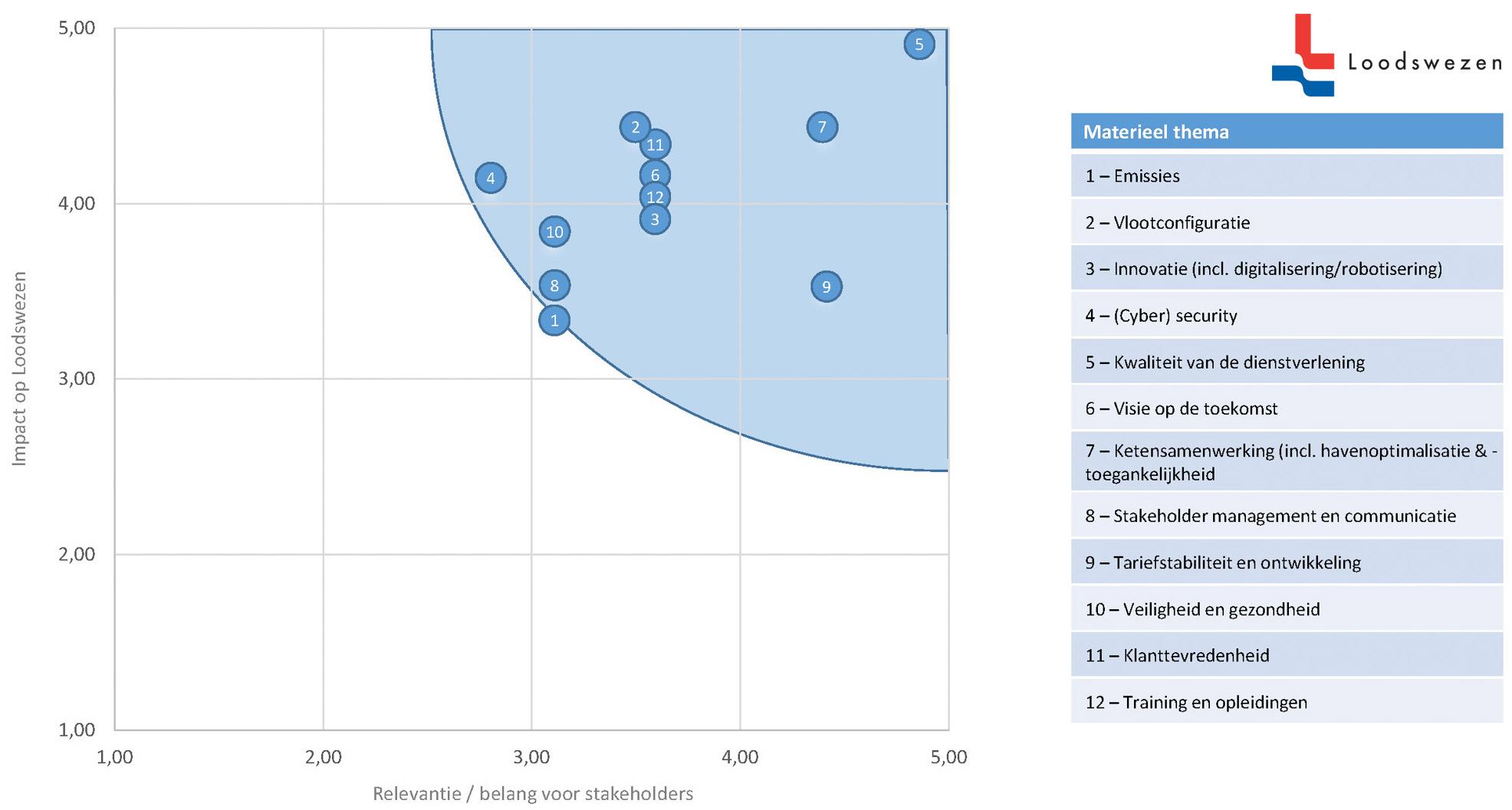 De missie van Nederlands Loodswezen toont onze ambitie: een ‘kwalitatief hoogwaardige en betrouwbare partner in de logistieke keten’ zijn. Daarnaast heeft het Loodswezen een inschatting gemaakt wat de stakeholders als de belangrijkste aspecten van de dienstverlening van het Loodswezen zouden benoemen. Deze zijn geplot in een materialiteitenmatrix.